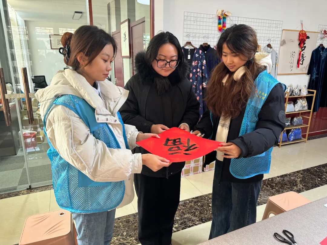 活动过程中,志愿者协助工作人员收集、整理用于展览的作品,确保展品的质量和完整性。工作人员向志愿者介绍五福的种类,说明福字的书写历程,志愿者在工作人员的指导下体验拓印福字红包、剪福字等非遗文化。